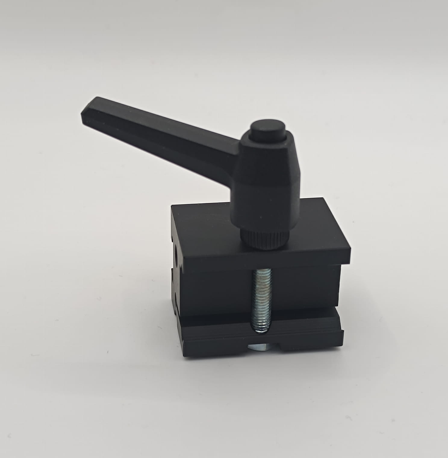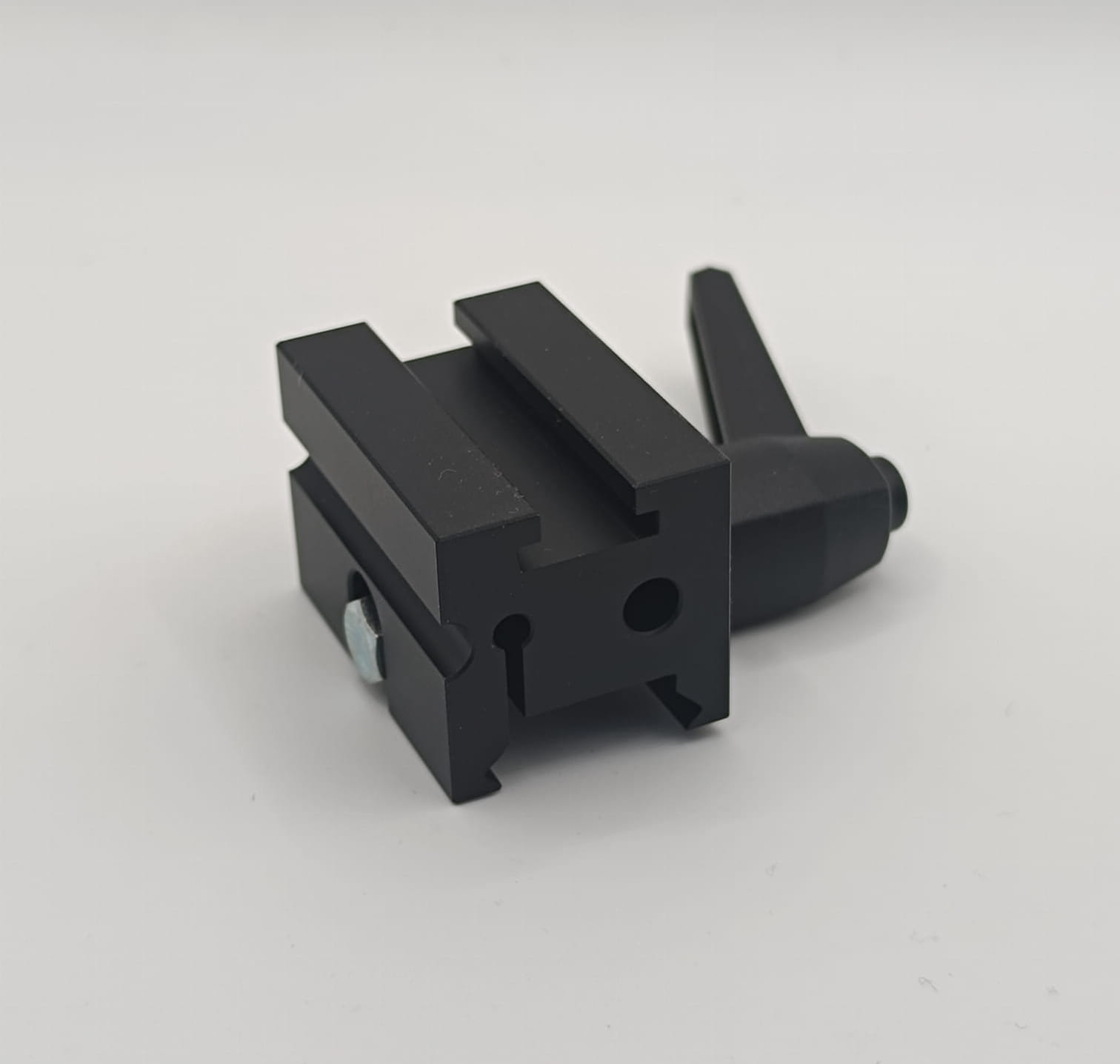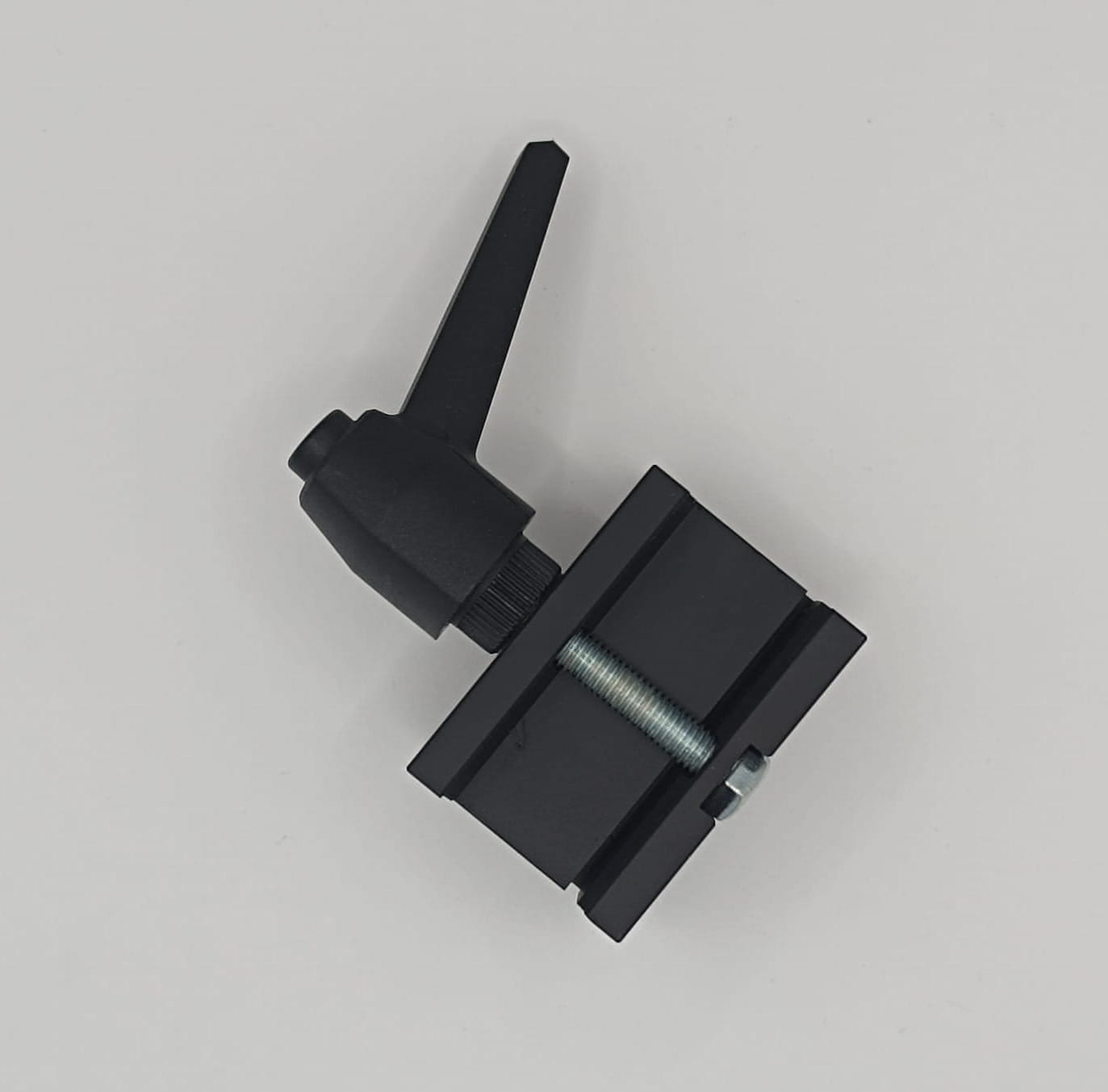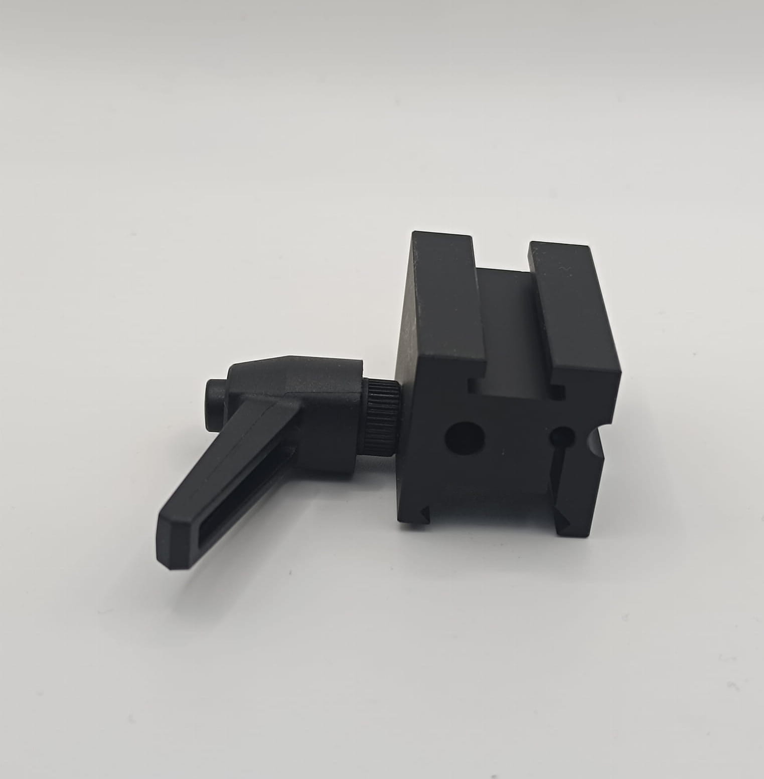 Adapter, przejściówka z anodowanego aluminium z regulacją zacisku przeznaczona do połączenia mocowania bipodu do osady za pomocą szyny UIT (np. Anschutz, Savage, CG) z przejściem na montaż za pomocą szyny typu Picatinny/RIS.