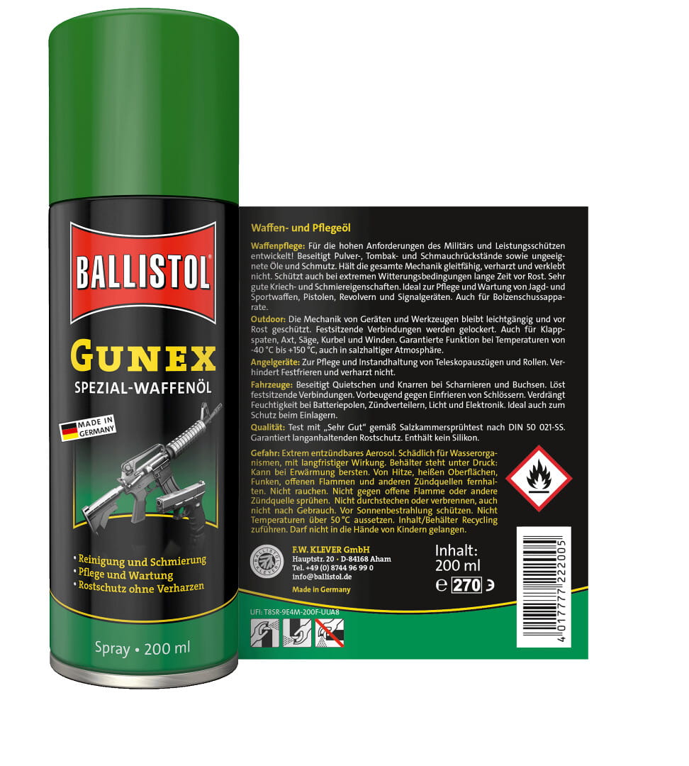 GUNEX 2000 nie łączy się z wodą, dlatego też idealnie chroni części metalowe przez rdzą. Ma bardzo dobre właściwości czyszczące, usuwa resztki prochu i tombaku a także starych zapieczonych olei. Dodatkową jego zaletą jest to, że nadaje poślizg mechanizmom trącym, nie zapieka się i nie klei. Preparat nie zawiera silikonu, żadnych związków zasadowych oraz FCKW.