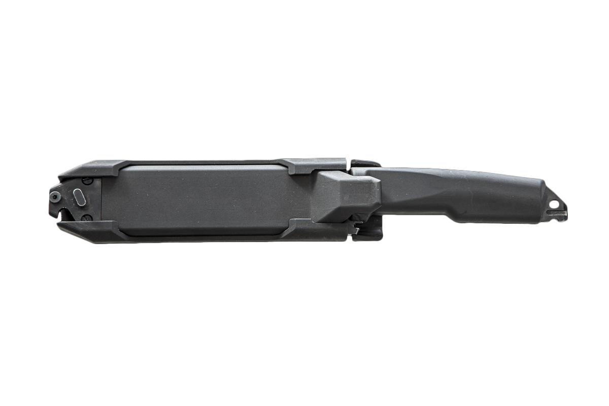 Nóż z częściowo ząbkowaną głownię typu drop-point wykonano ze stali narzędziowej NCV1, którą na całej powierzchni pokryto czarną powłoką antyodblaskową, co dodatkowo chroni nóż przed korozją. Do kompletu z bagnetem dołączono dwuczęściową kaburę składającą się z kabury oraz bazy. Wysuwana kabura w połączeniu z otworem znajdującym się na głowni bagnetu tworzy sprawne nożyce do cięcia drutu.