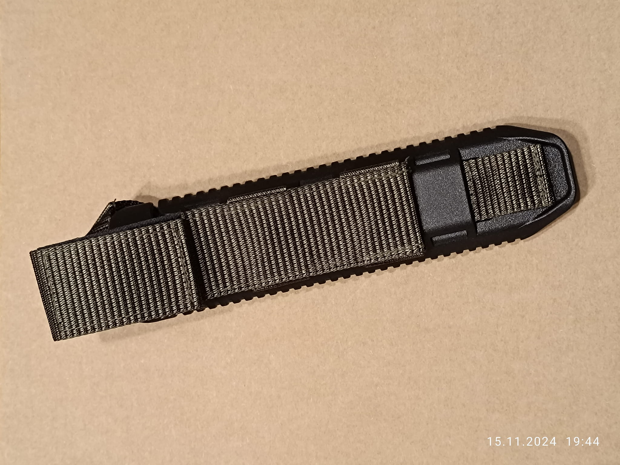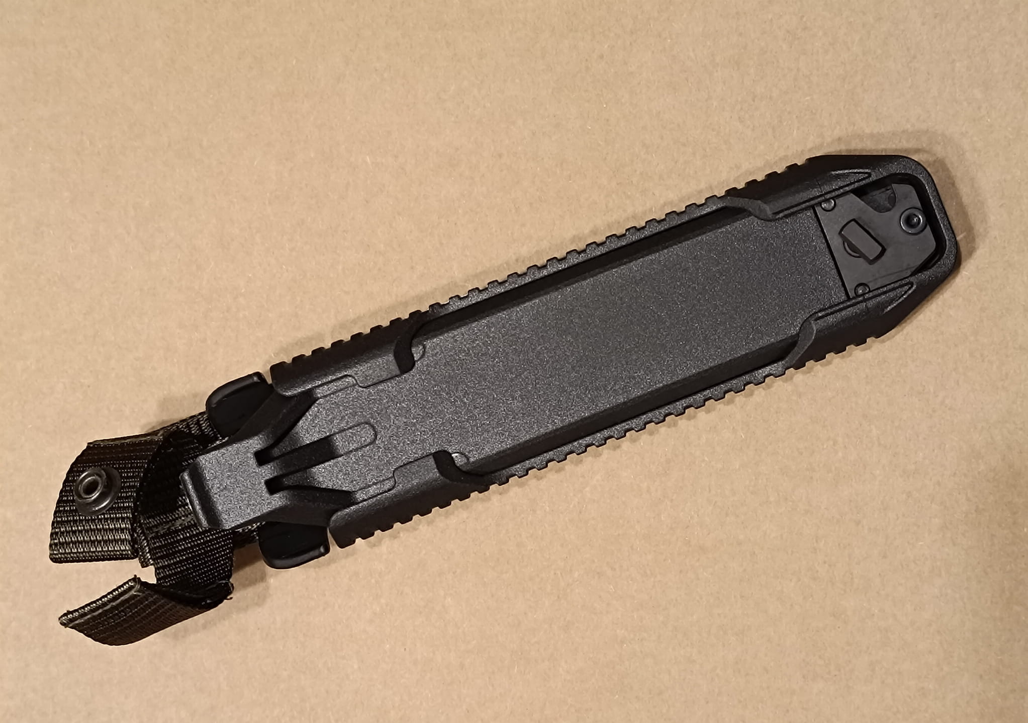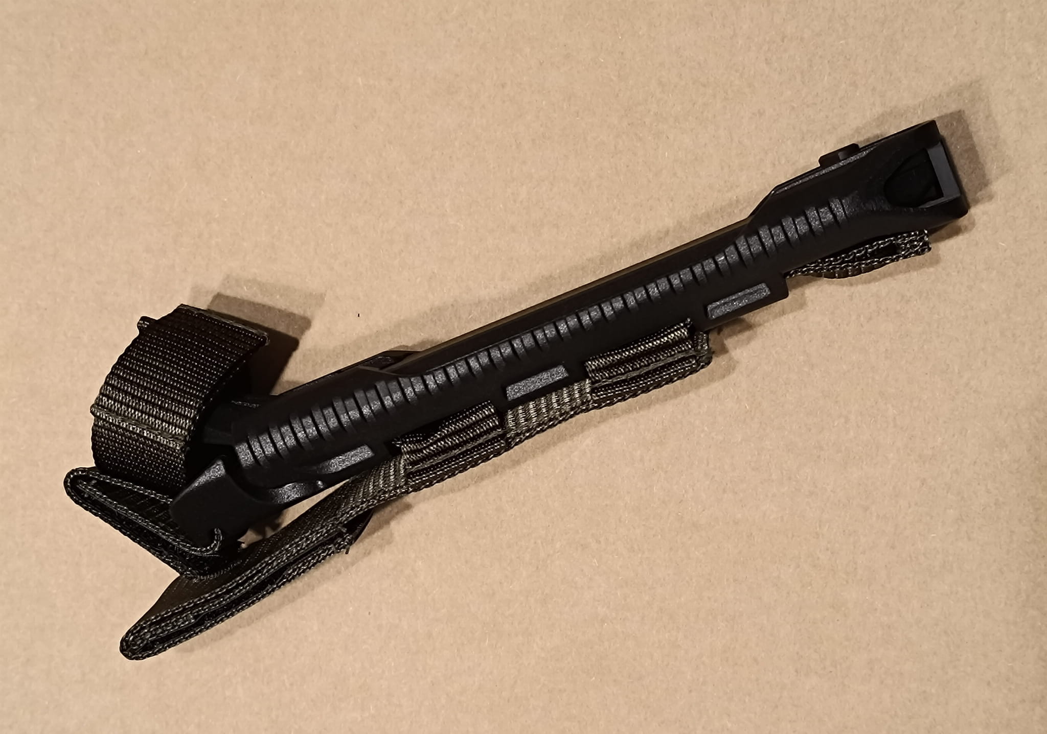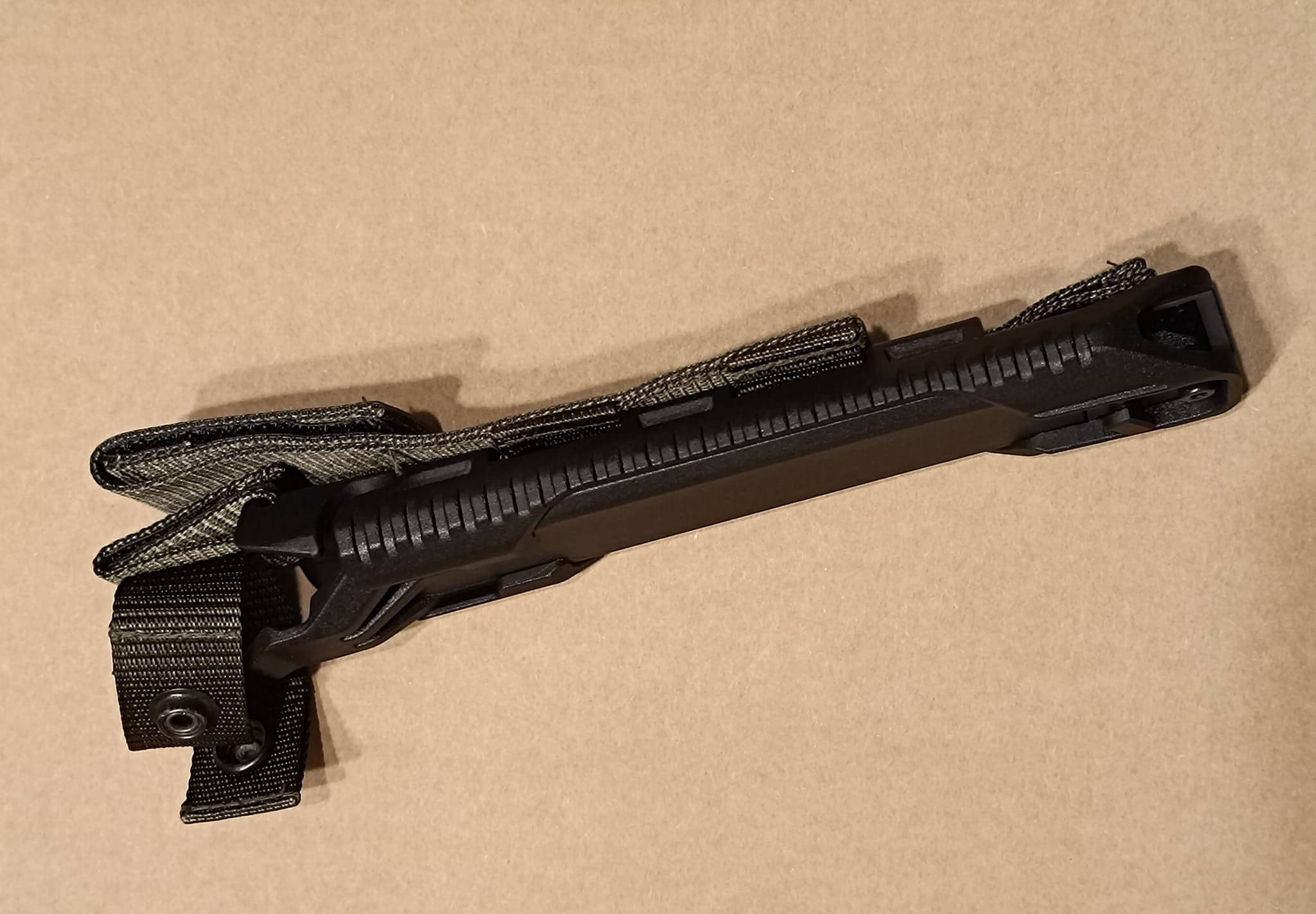 Wytrzymała nylonowa taśma zamocowana do bazy umożliwia przytroczenie bagnetu do pasa lub do elementów ekwipunku wyposażonych w system MOLLE. Oprócz tego pasek z zatrzaskiem w górnej części bazy zabezpiecza nóż przed wypadnięciem.