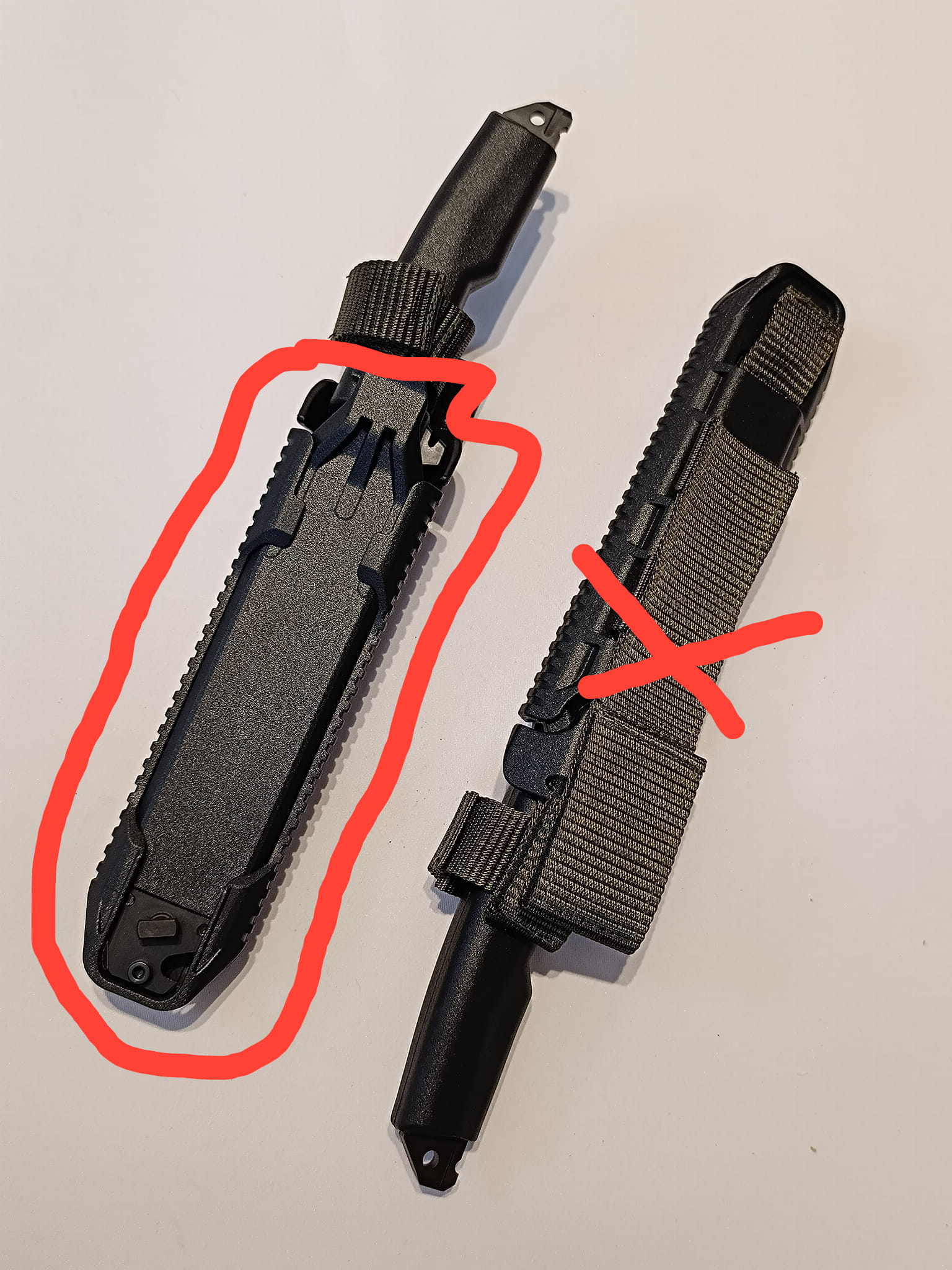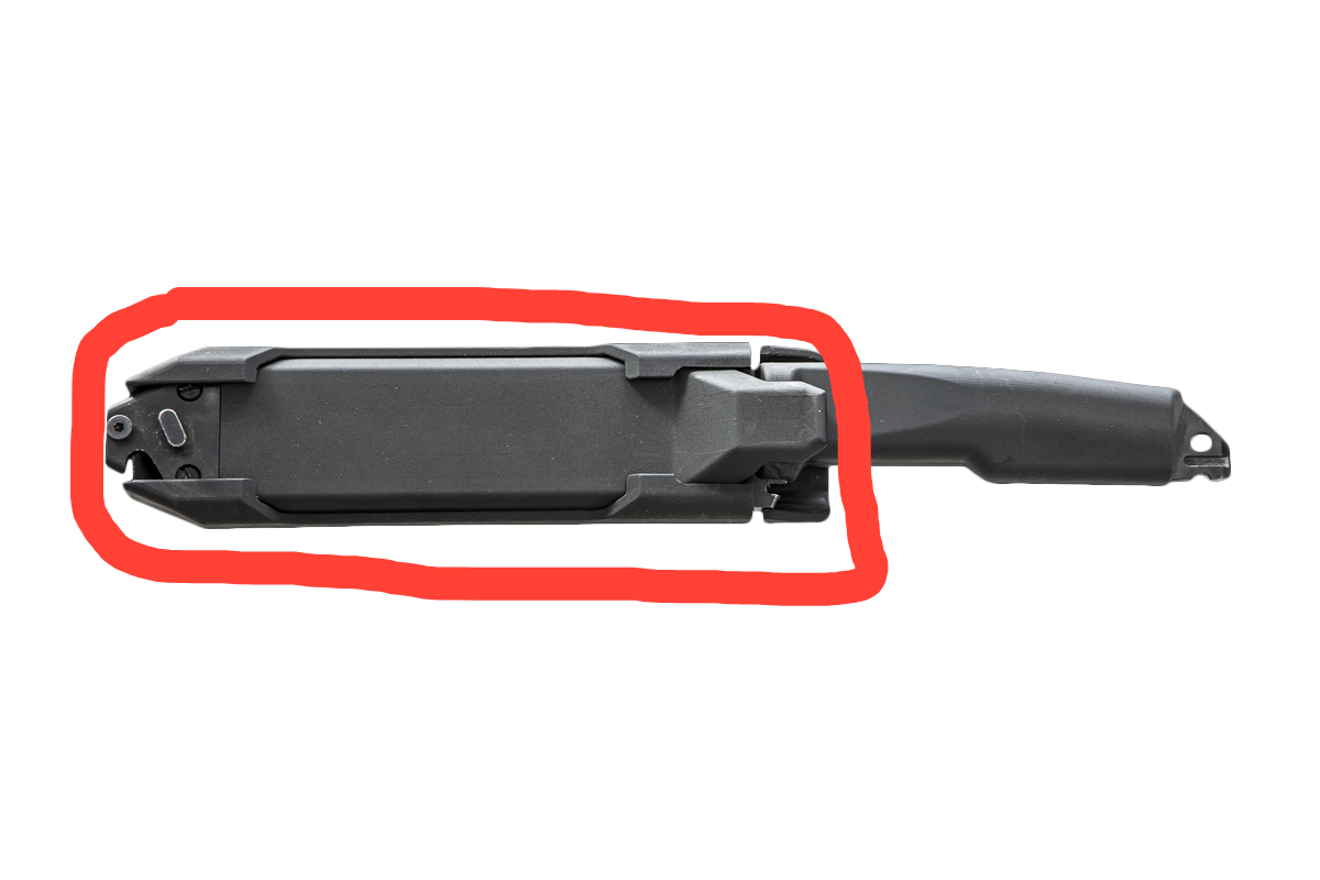 Oferujemy oryginalną część do bagnetu dla karabinka MSBS GROT: kompletna pochwa do bagnetu (nie zawiera bazy z paskami mocującymi) na zdjęciu zaznaczono obwiednią koloru czerwonego.