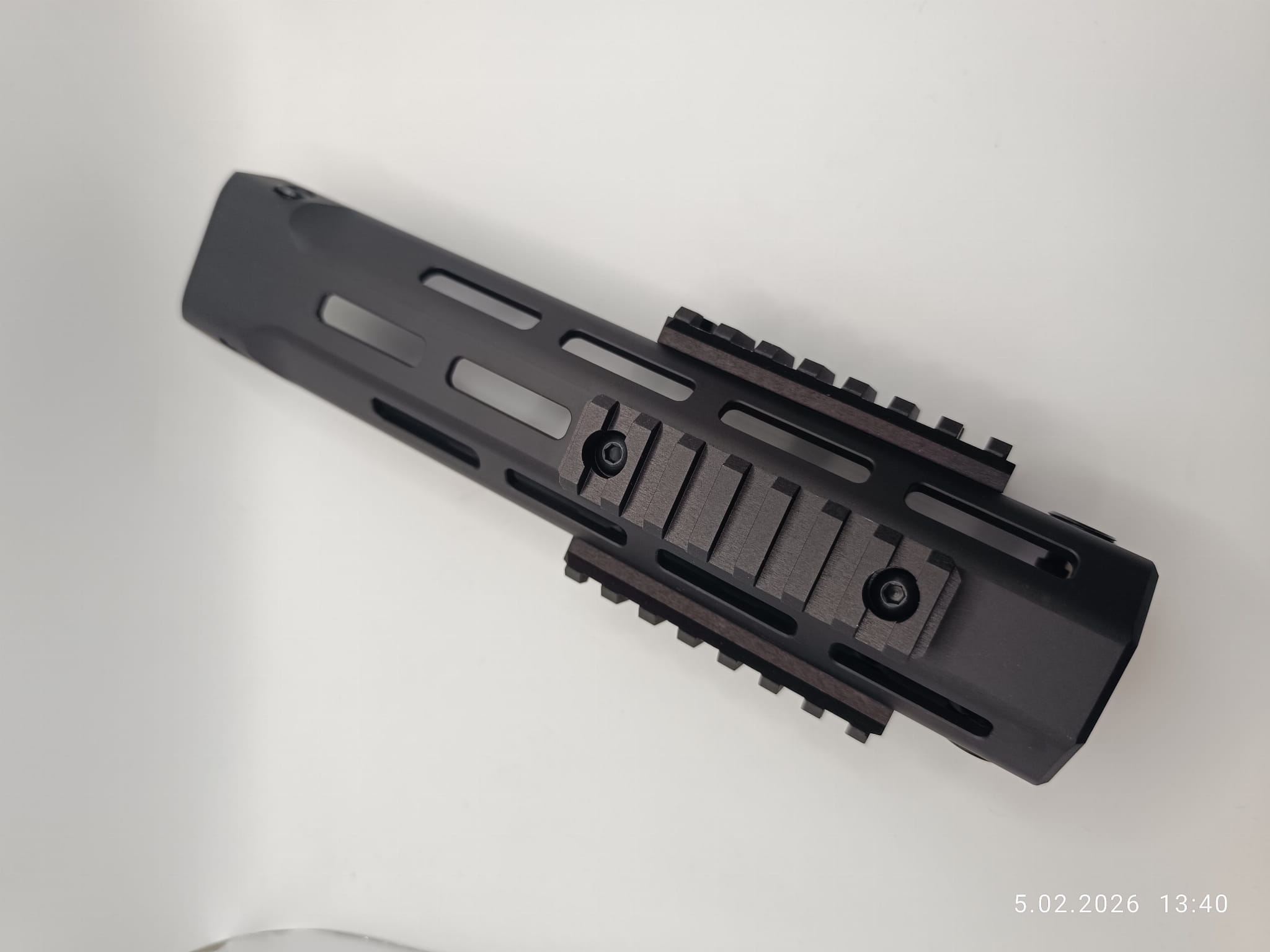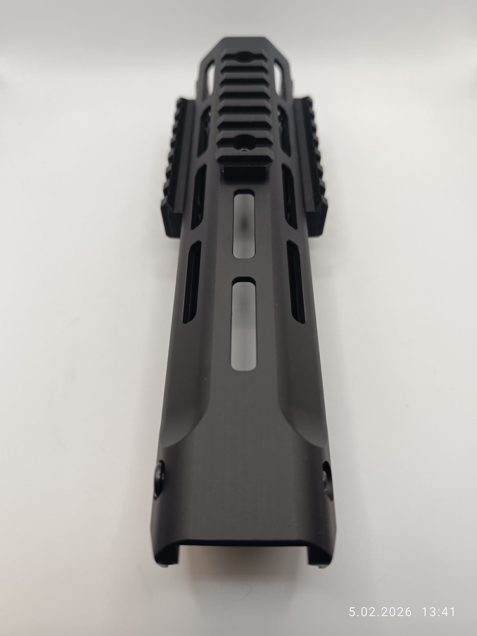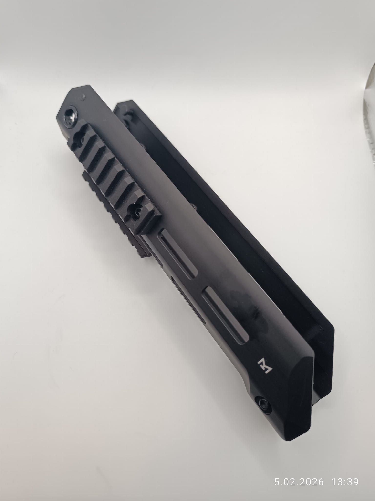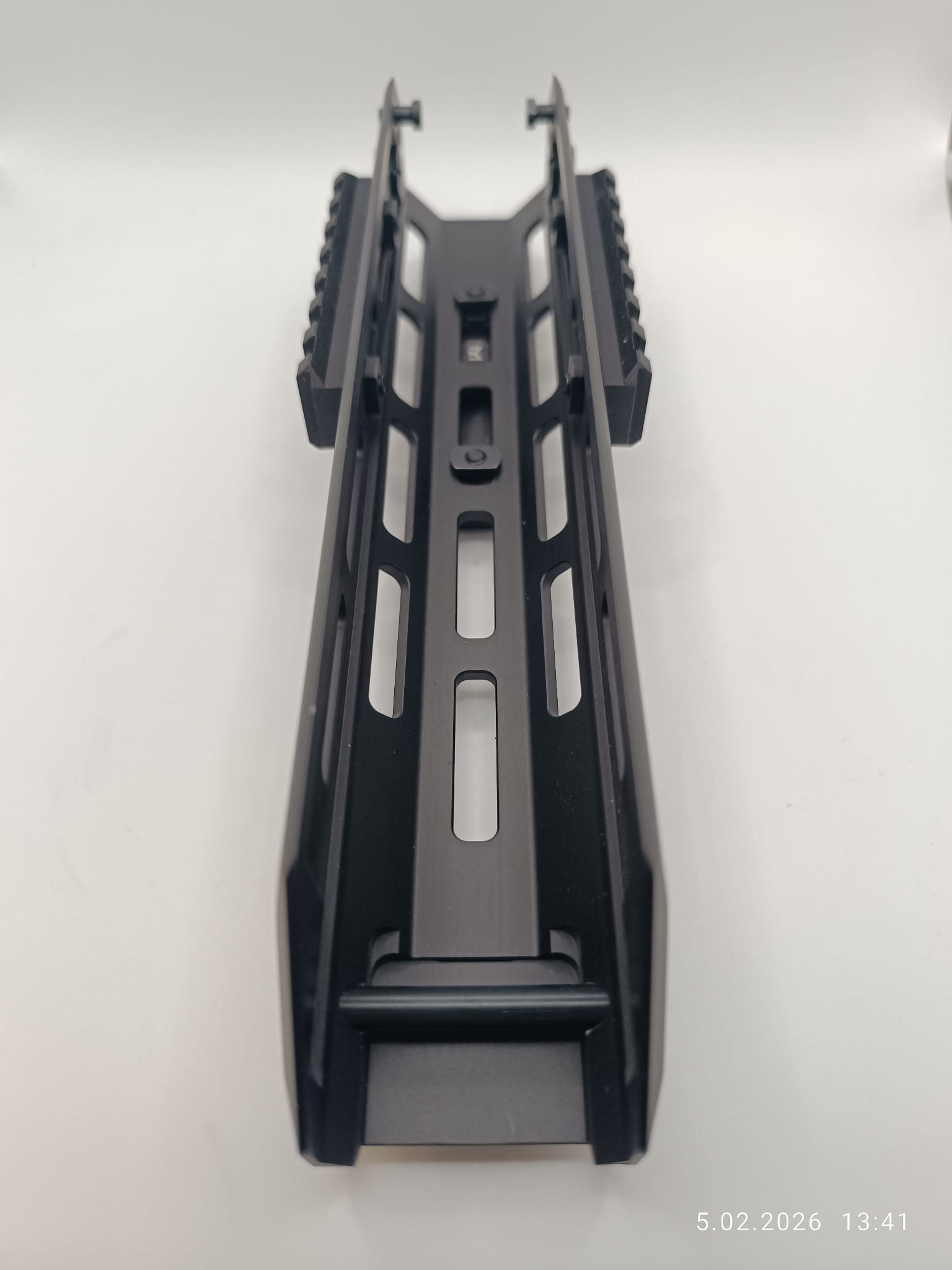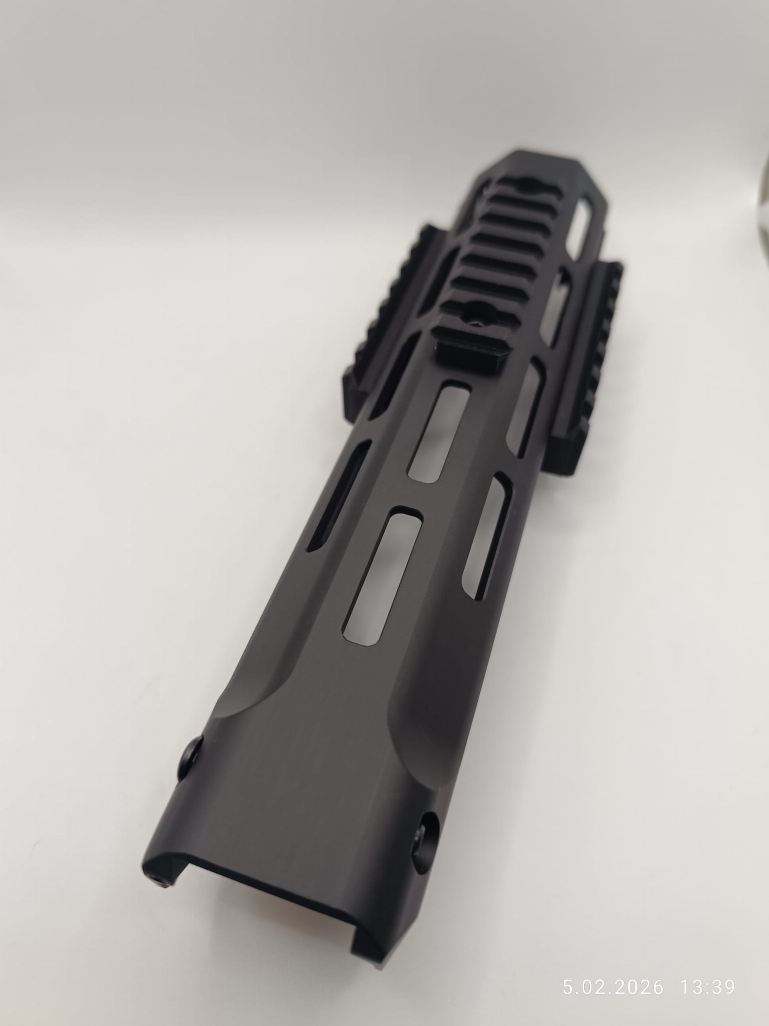 Zespół krótkiego łoża ze slotami M-LOK z 3 szynami Picatinny, gniazdami pasa, kołkami łoża do karabinka MSBS GROT A1/A2 wykonane z aluminium lotniczego o wysokiej wytrzymałości.