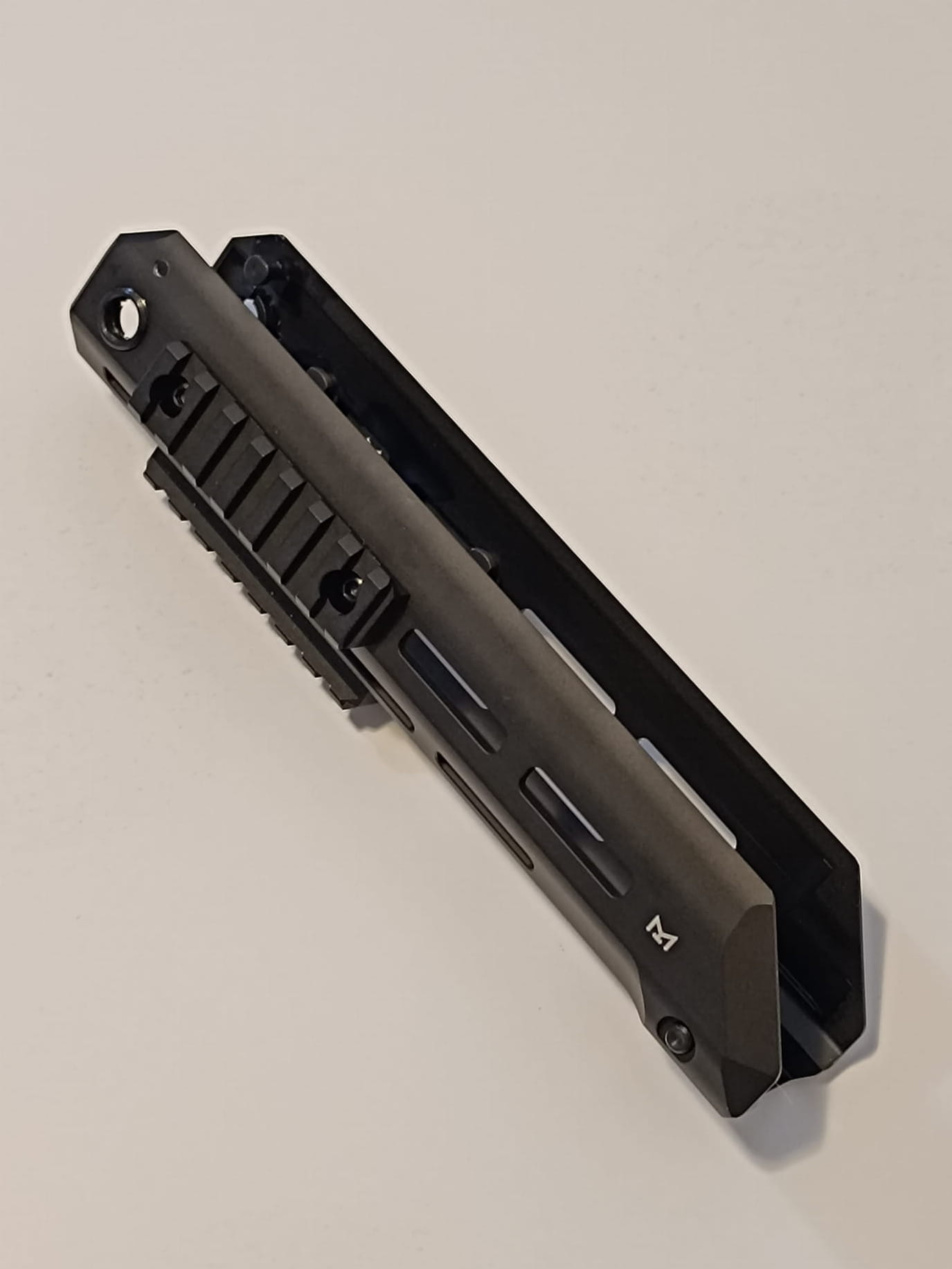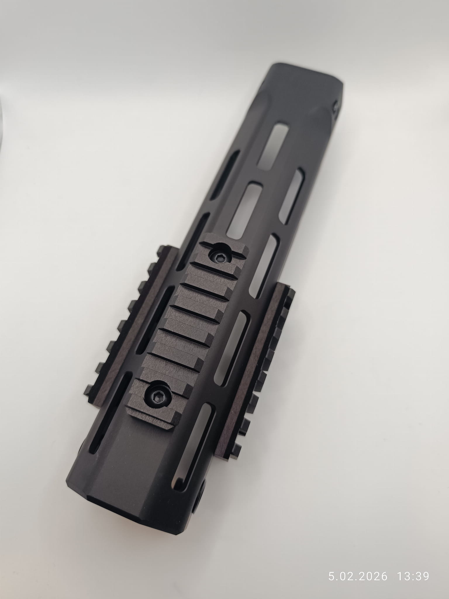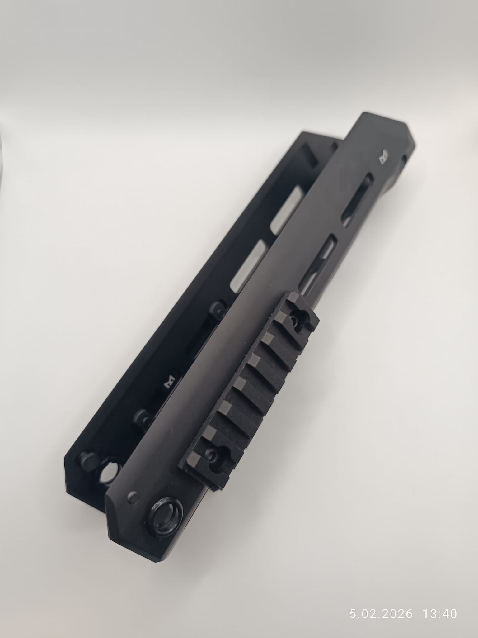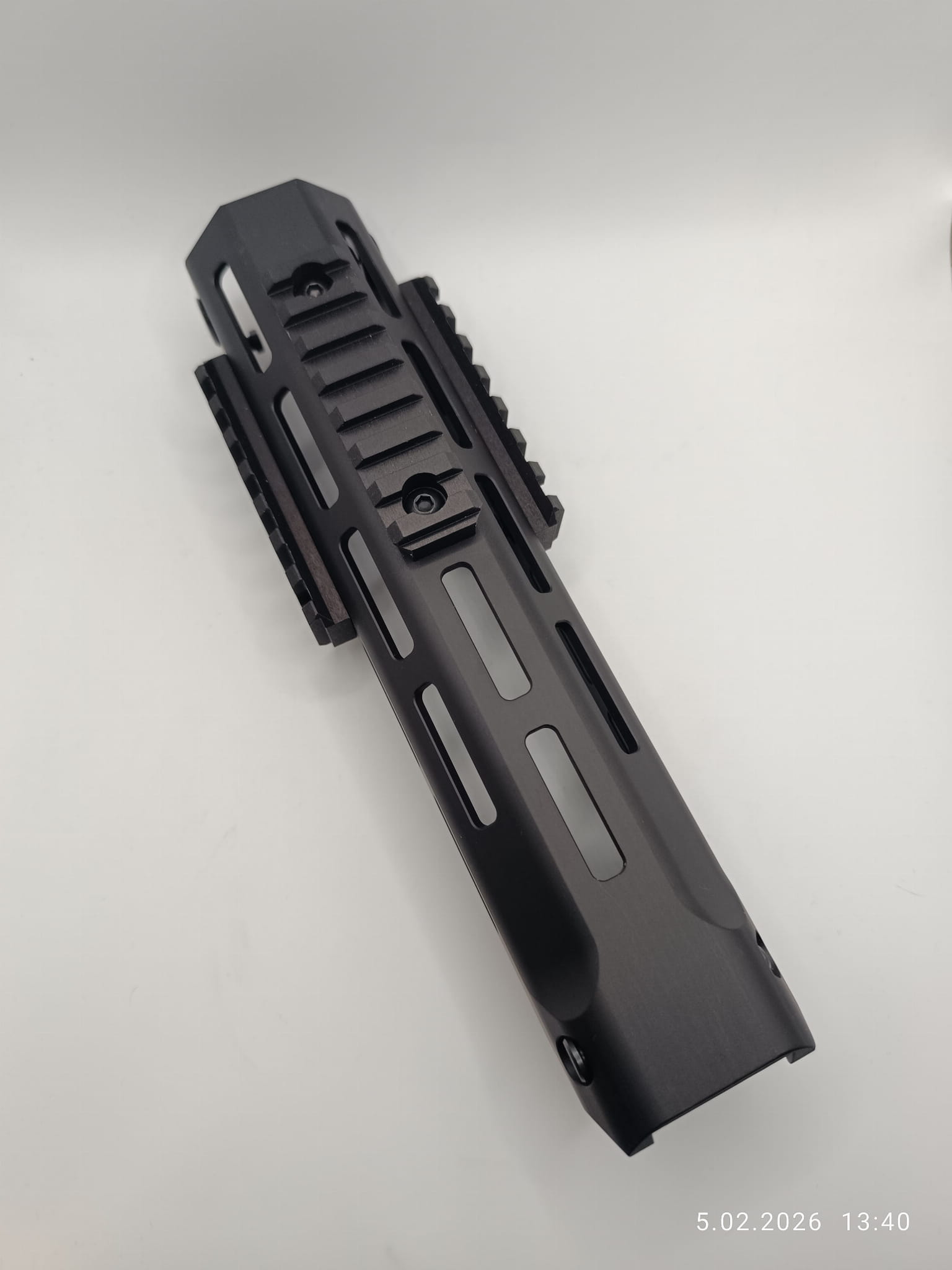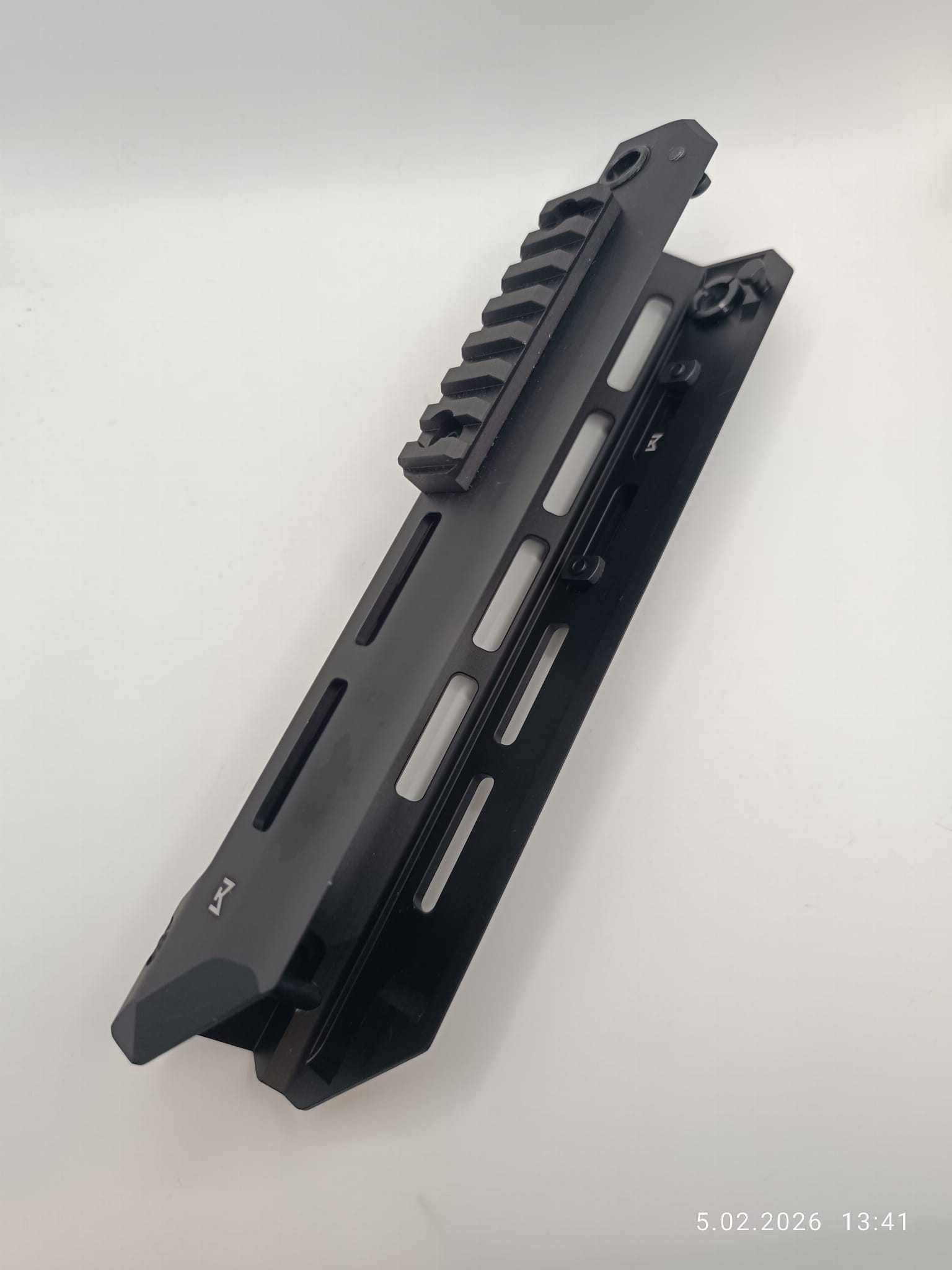 Zespół krótkiego łoża ze slotami M-LOK z 3 szynami Picatinny, gniazdami pasa, kołkami łoża do karabinka MSBS GROT A1/A2 wykonane z aluminium lotniczego o wysokiej wytrzymałości.