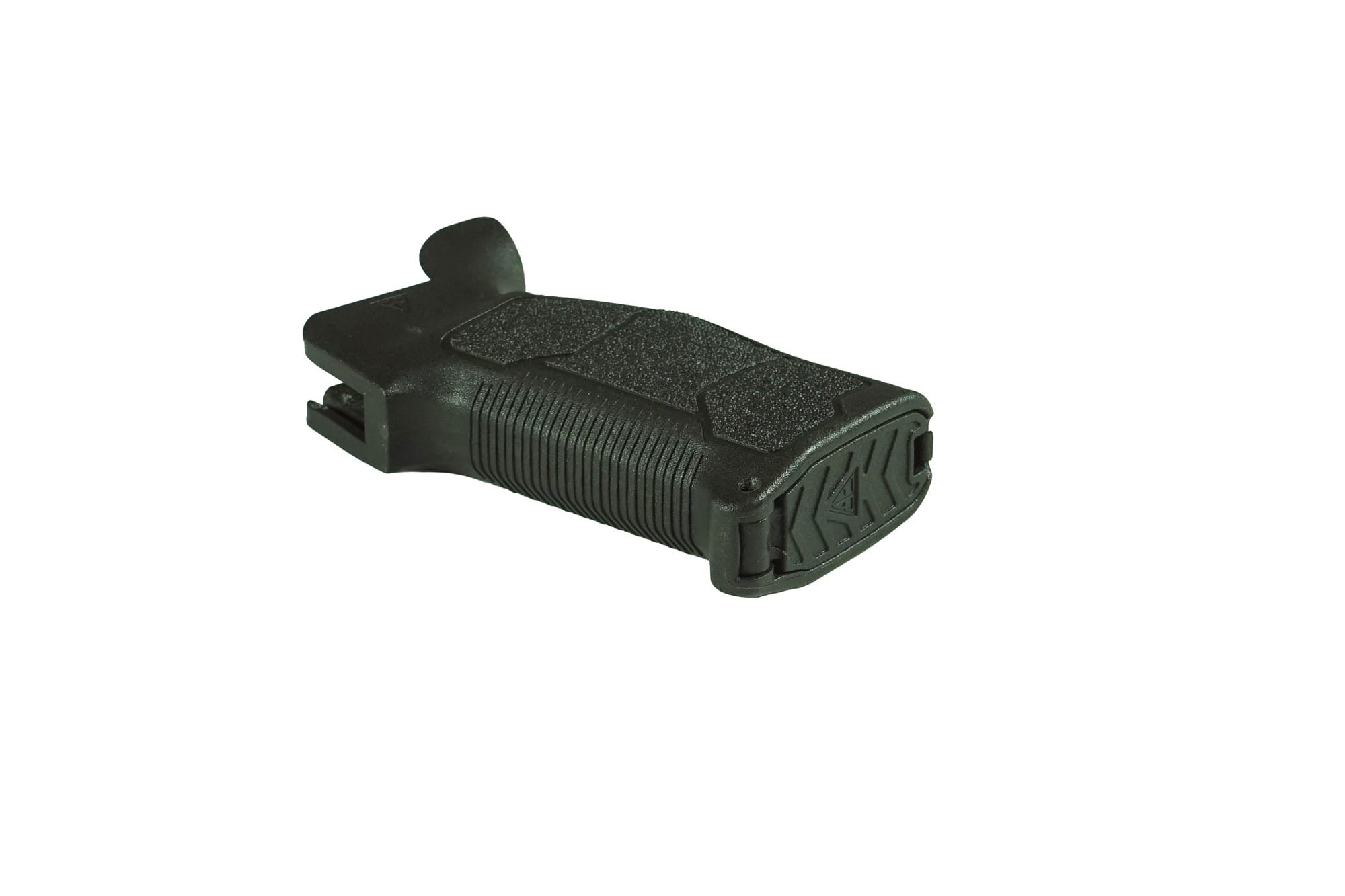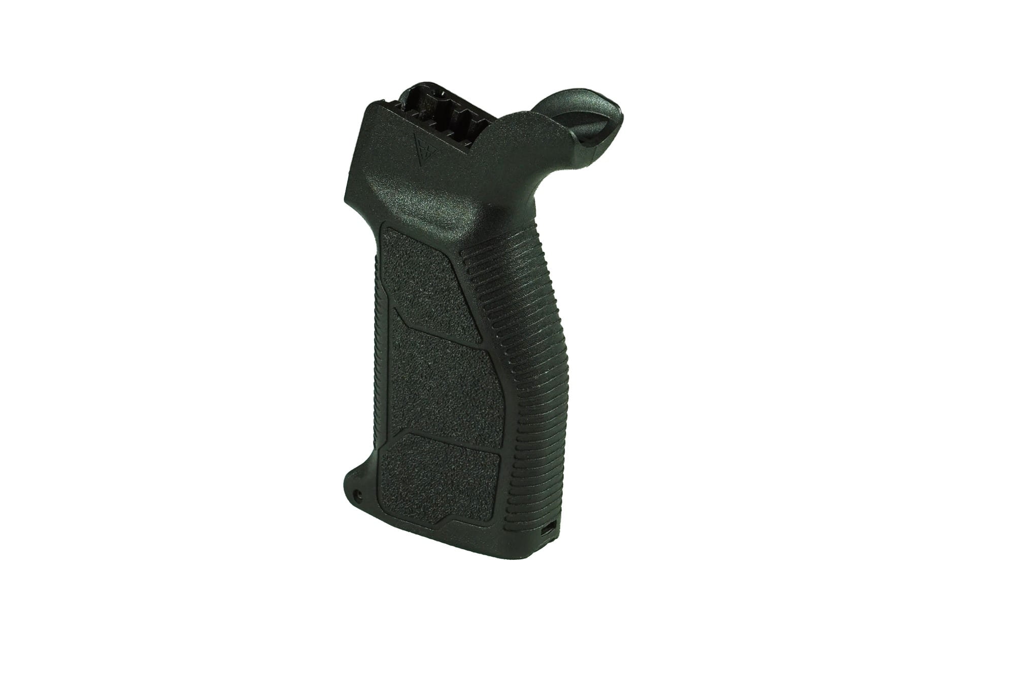 Chwyt pistoletowy wykonany jest z wysoce wytrzymałego tworzywa sztucznego, jest w pełni zgodny z systemem montażowym karabinków AR, dzięki czemu może być w nim stosowany. Specjalnie zaprojektowana ergonomia chwytu m.in. fazowana przednia część, poszerzona część tylna, ścięte boki w dolnej części, odpowiednie załamanie kąta i wyprofilowanie w tylnej części, powiększenie korytka na kciuk „Thumb rest” daje lepsze uczucie wypełnienia dłoni zwiększając kontrolę nad bronią. Chwytność zarówno osłoniętą, jaki nieosłoniętą dłonią poprawia specjalne agresywne fakturowanie powierzchni bocznych. Dodatkowe prążkowania poprzeczne z przodu i z tyłu dają pewniejszy chwyt. Kąt rękojeści wynosi 16 stopni, jest zaliczany do rękojeści bardziej pionowych. Pionowa rękojeść jest uznawana za bardziej uniwersalną i rekomendowaną dla strzelców, którzy strzelają z krótkiej kolby z postawy leżącej (karabiny wyborowe), z broni w systemie bezkolbowym albo do broni typu PDW (Personal Defense Weapon). Rękojeść jest dłuższa od innych wyrobów tego typu, co umożliwia odpowiedni chwyt osobom z bardzo dużymi dłońmi (przy czym nie stanowiąc problemu dla osób z mniejszym rozmiarem dłoni), dodatkowo w przedniej-dolnej części chwytu znajduje się ogranicznik, który zapobiega wyślizgnięciu się dłoni. Wewnętrzna część chwytu jest pusta i zasłonięta estetyczną uchylną klapką, umożliwiając chowanie w niej niezbędnych akcesoriów (np. miękki wycior do broni).