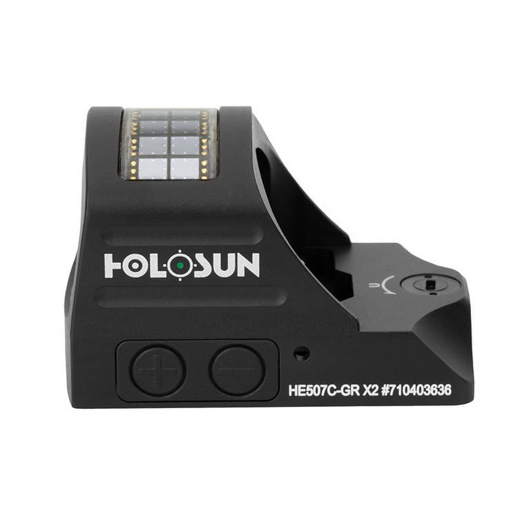 HE507C-GR X2 jest otwartym celownikiem kolimatorowym przeznaczonym do zastosowania na pistoletach. Wyposażony jest w diodę Holosun Super LED o żywotności baterii do 50 tys. godzin, systemy Multi-Reticle, Solar Failsafe oraz Shake Awake.