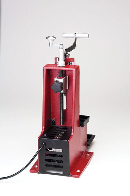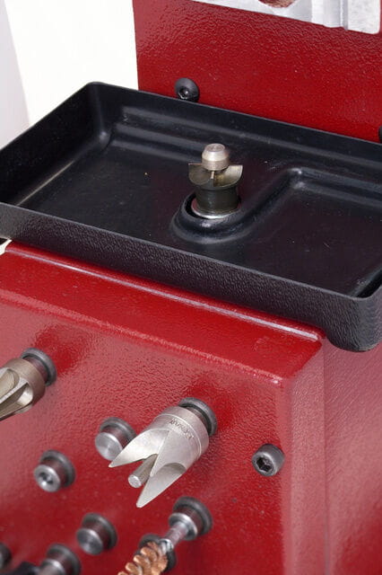 Stacja przygotowania łusek. Posiada napędzany elektrycznie przyrząd do skracania łusek (trymer) oraz 6 napędzanych gniazd na końcówki do obróbki łusek.