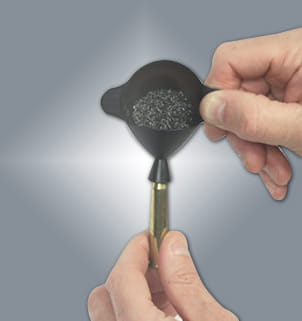 Sprawdzony w praktyce talerzyk z lejkiem do nasypywania odważonej ilości prochu bezpośrednio do łusek.