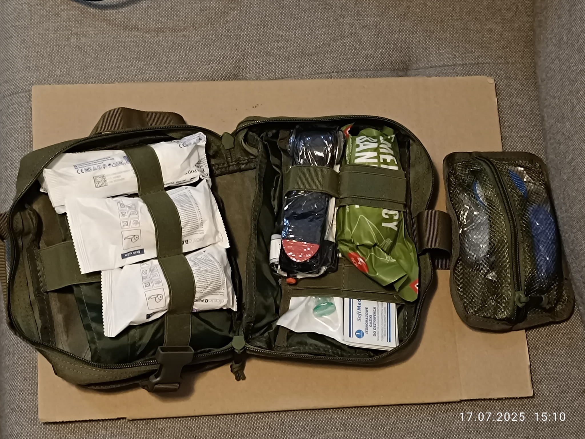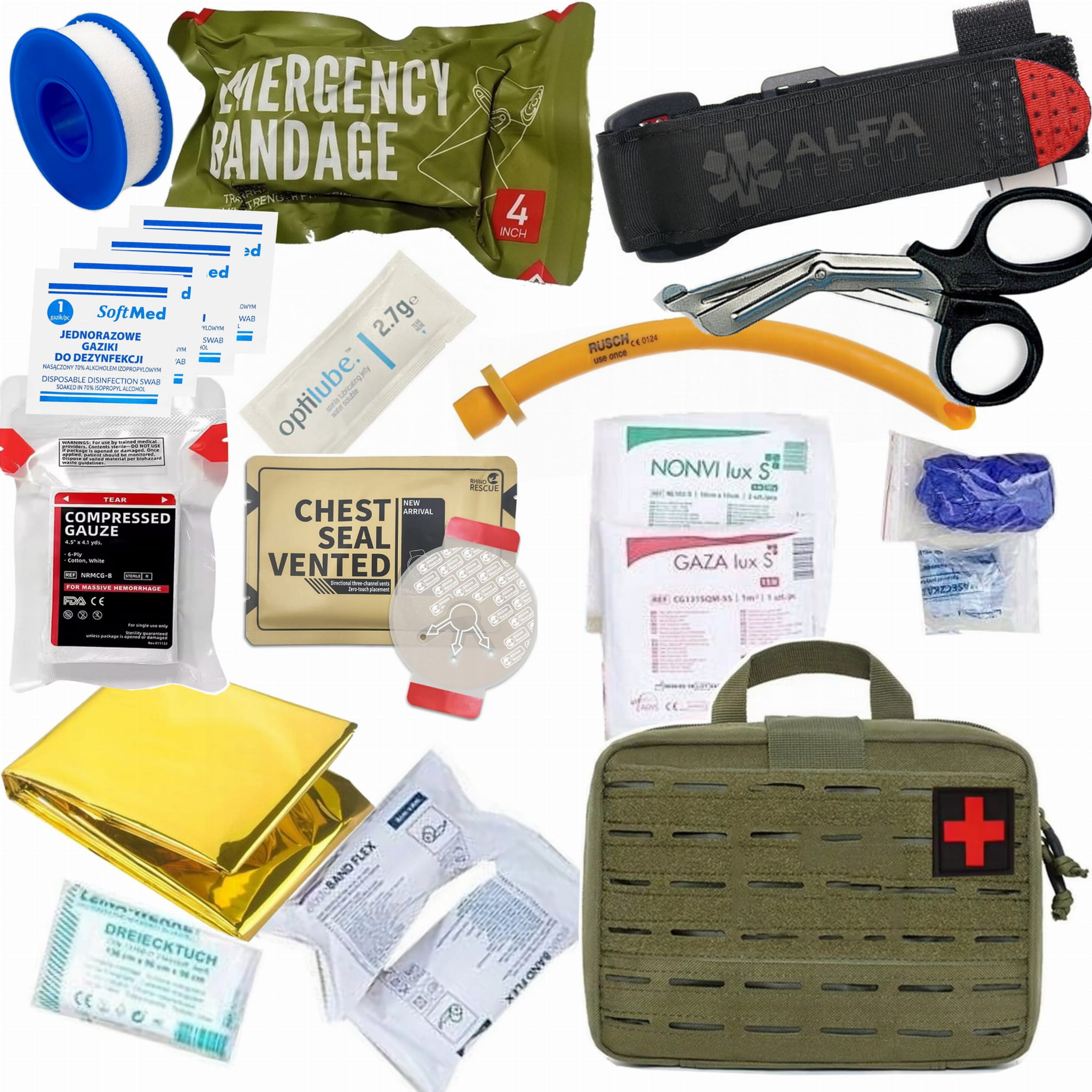 Apteczka z wyposażeniem dla strzelca sportowego i służb mundurowych.