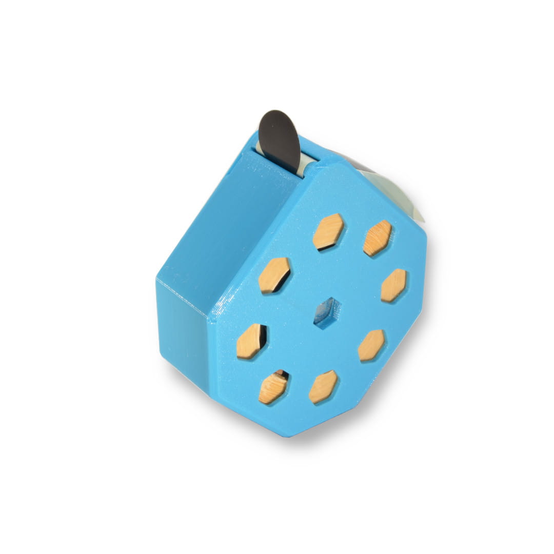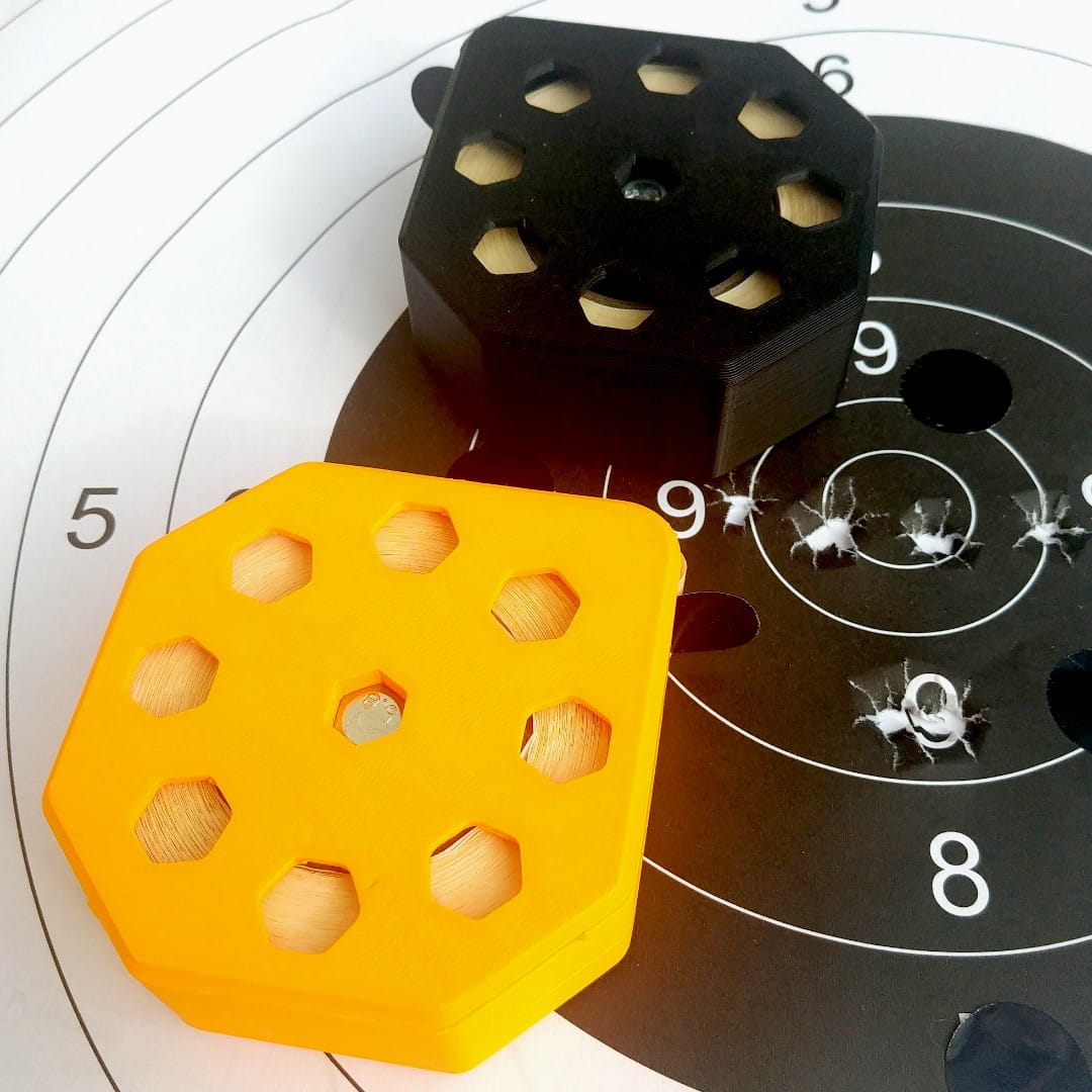 Przemyślany, sprytny i prosty w obsłudze, łatwy do przenoszenia (np. w kieszeni) podajnik do rolki zaklejek tarczowych 1000 szt. o średnicy 20 mm. Radykalnie ułatwia zaklejanie przestrzelin na tarczy, wystarczy wysunąć koniec taśmy ze szczeliny i podajnik za każdym razem poda jedną zaklejkę. Bez rozwijania i plątania się taśmy.