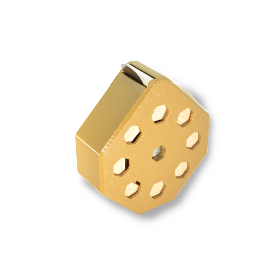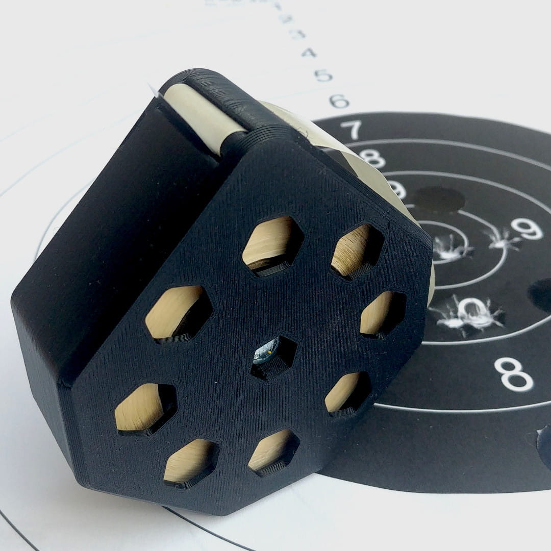 Przemyślany, sprytny i prosty w obsłudze, łatwy do przenoszenia (np. w kieszeni) podajnik do rolki zaklejek tarczowych 1000 szt. o średnicy 20 mm. Radykalnie ułatwia zaklejanie przestrzelin na tarczy, wystarczy wysunąć koniec taśmy ze szczeliny i podajnik za każdym razem poda jedną zaklejkę. Bez rozwijania i plątania się taśmy.
