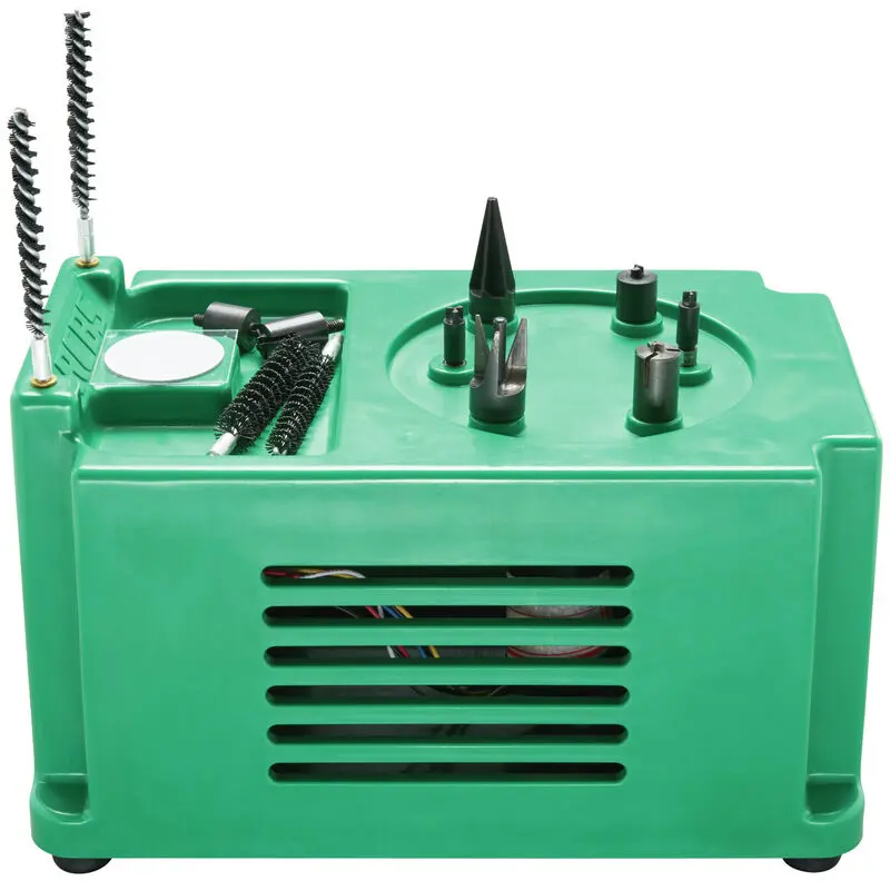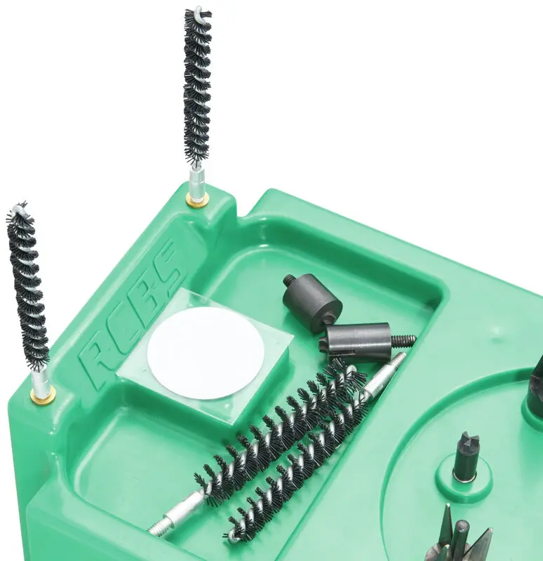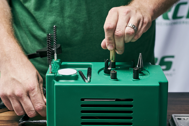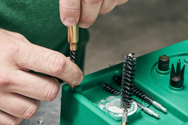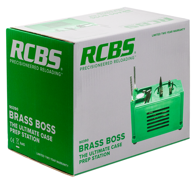 Elektryczna maszynka firmy RCBS "Brass-Boss" posiadająca najpopularniejsze przyrządy do obróbki łusek do powtórnej elaboracji. Dzięki temu przemyślanemu produktowi można sprawnie i szybko przeprowadzać podstawowe czynności związane z obróbką łusek. Kombajn posiada 6 stałych głowic, do których montuje się potrzebne końcówki robocze, w tym do usuwania opiłków zz pomocą pędzelka.