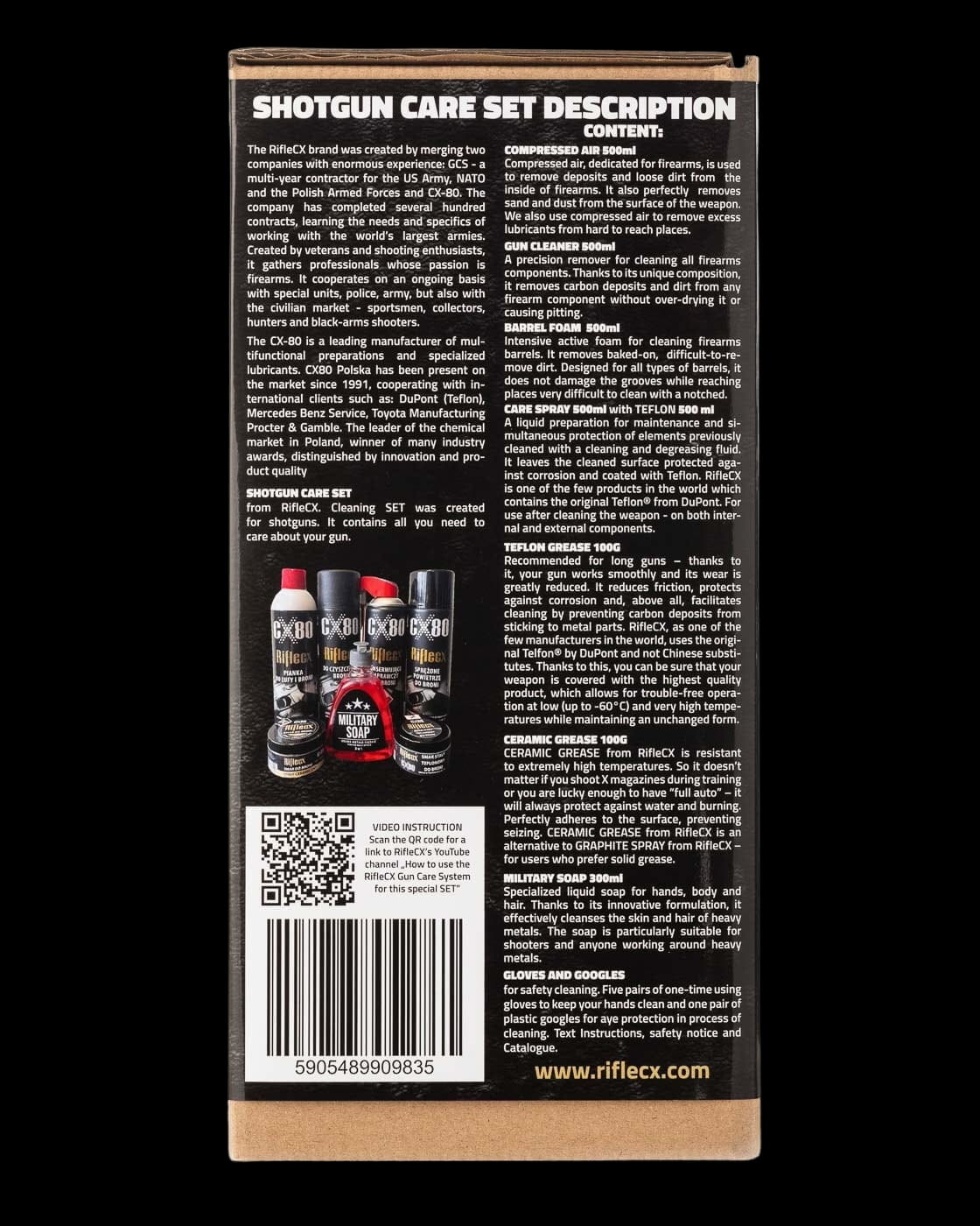 Kupując zestaw do shotgun Riflecx- Gun Care System otrzymujesz wszystko co niezbędne aby właściwie zadbać o Twoją broń. Z tyłu pudełka znajdziesz opis preparatów a z boku kod QR, który poprowadzi Cię do filmów instruktażowych Riflecx na YouTube, gdzie krok po kroku pokażemy Ci jak stosować nasz system.