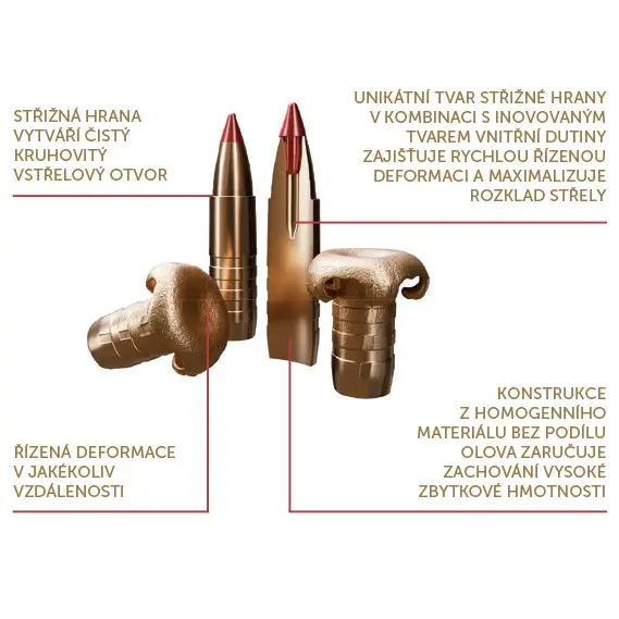 Nowa generacja pocisków myśliwskich BEZ OŁOWIU. Opływowy kształt z nową polimerową końcówką zapewnia płaską trajektorię przy zachowaniu maksymalnej energii. Polimerowa końcówka zapewnia kontrolowaną deformację na każdej odległości strzału. Jednorodna, bezołowiowa konstrukcja gwarantuje wysokie zatrzymanie wagi resztkowej penetrującej tusze zwierzyny łownej.