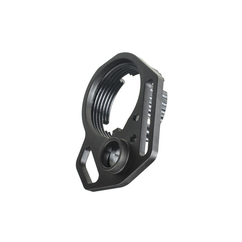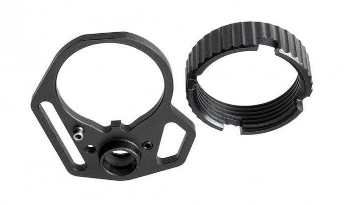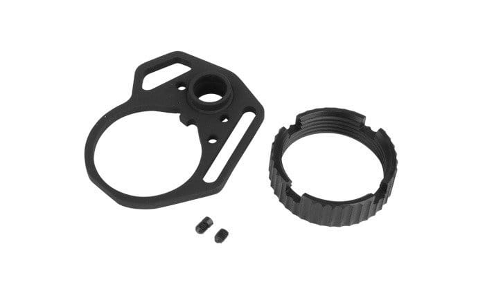 Komplet płytki i nakrętki prowadnicy kolby do karabinków AR-15 umożliwiający wykorzystywanie wielu rodzajów zawieszeń pasa nośnego broni.