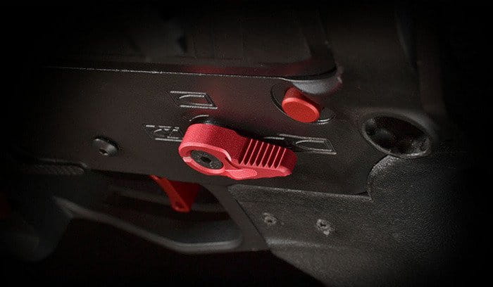 Niskoprofilowy selektor ognia do karabinków AR-15 z żebrowaną konstrukcją ułatwiającą obsługę - kolor czerwony.