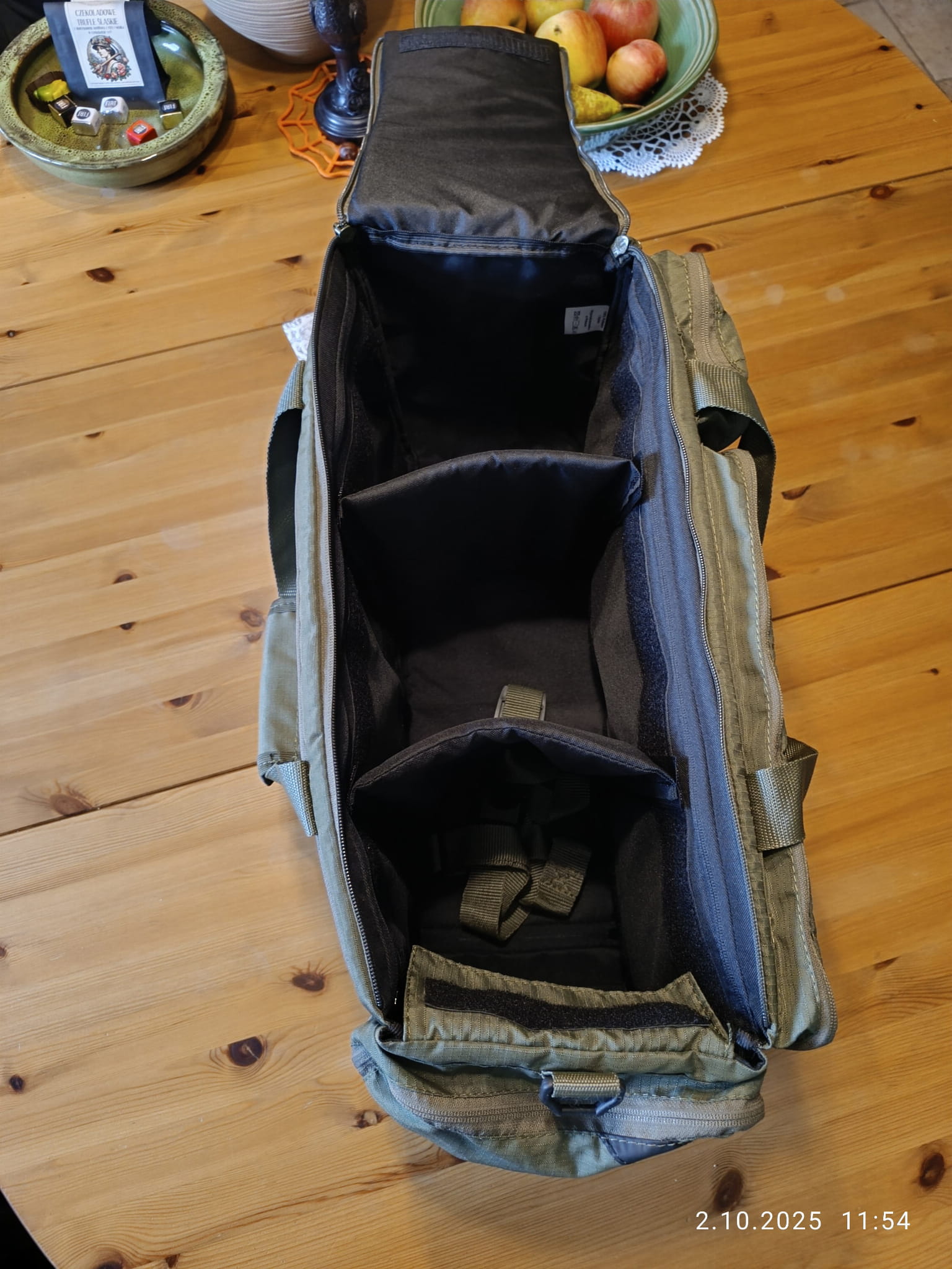 - 2 przegródki z możliwością demontażu, dwie rączki z taśmy nośnej, zaczepy na pasek na ramię, klamry i złącza polskiego producenta, na dnie gumowe jeże,