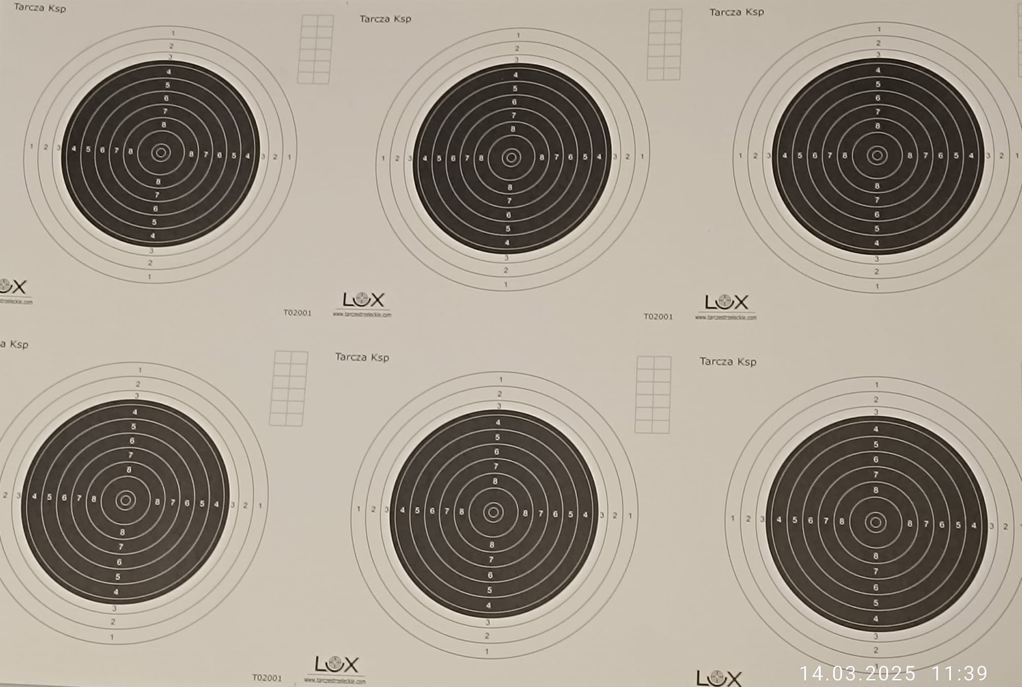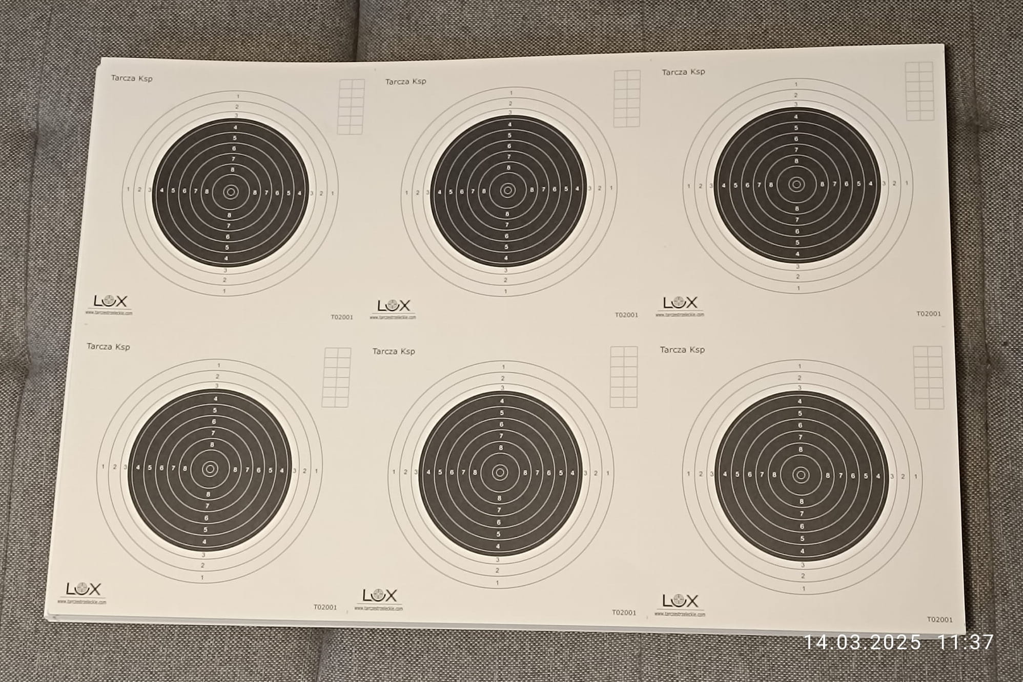Tarcza zbiorcza składająca się z 6 tarcz kołowych z numerowanymi pierścieniami. Tarcza wykonana jest na kartonie LUX 200g odcień kremowy. Przeznaczona do strzelania karabinka sportowego.