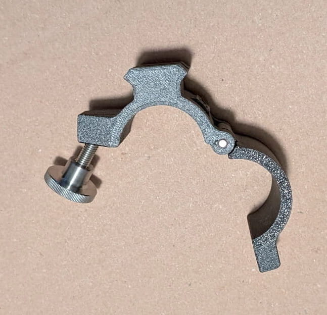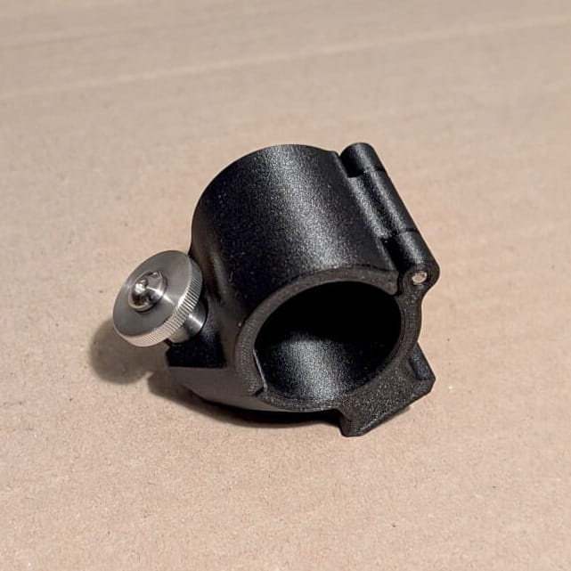 Obejma posiada funkcję szybkiego demontażu i montażu – odkręca się śrubę radełkowaną oraz odchyla górną połówkę obejmy i gotowe. Pełne wypełnienie zapewnia sztywność i niezawodność zacisku. Śruba radełkowana i kołek zawiasu wykonane zostały ze stali nierdzewnej.