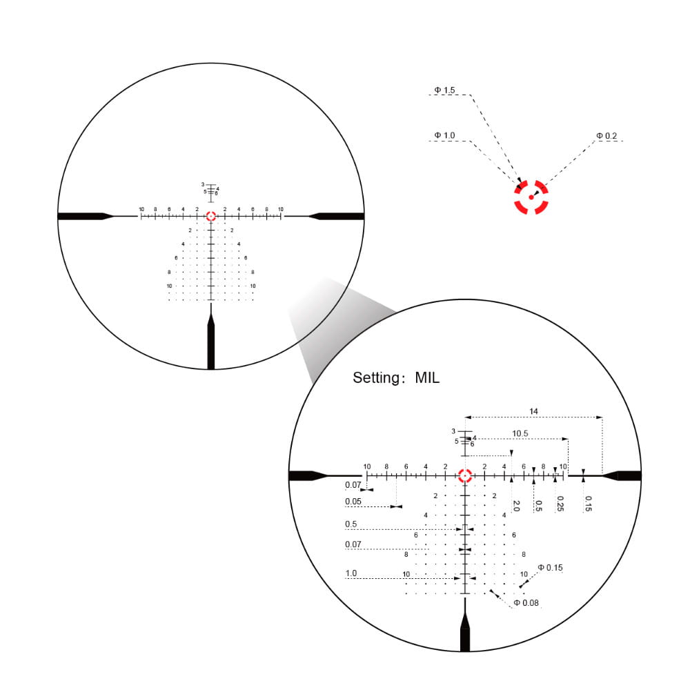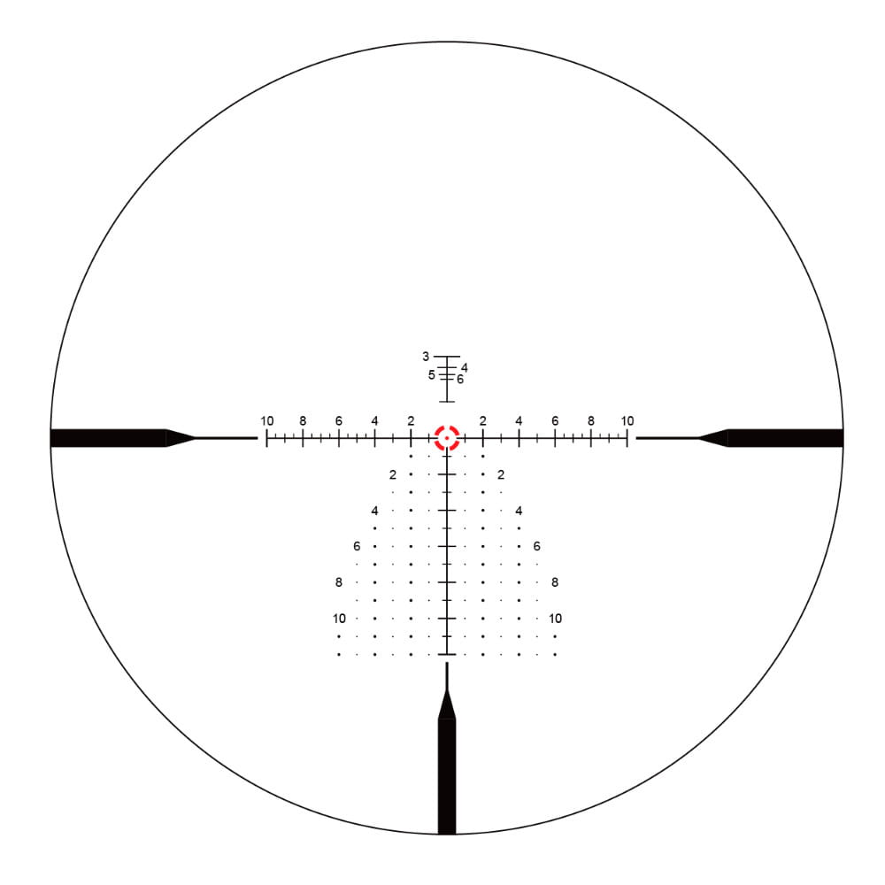 Producent wyposażył lunetę w podświetlany znak celowniczy typu VET-RAR 2 osadzony na pierwszym planie (FFP). Charakteryzuje się siatką, która wraz z większym przybliżeniem ukazuje widok umożliwiający precyzyjne celowanie w układzie jednostek MIL. Pozwala to na odpowiednie wyregulowanie celownika, kiedy zajdzie takowa potrzeba. Dostęp do wieżyczek regulacyjnych znajduje się pod odpowiednimi nakrętkami na boku i górze korpusu.