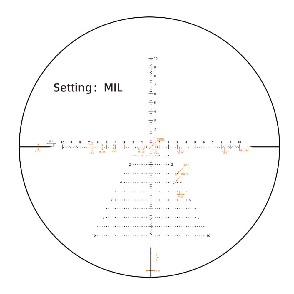 Naniesione linie na siatce umożliwiają ocenienie odległość od celu i jego rozmiarów, a także późniejszą manualną korektę dla opadu pocisku. Korekty można wprowadzić poprzez wieżyczki regulujące celownik w pionie i poziomie ze specjalnym wysunięciem pełniącym rolę blokady. Regulacja odbywa się o 1/10 MIL na klik w zakresie 25 MIL w poziomie i 12 MIL w pionie.
