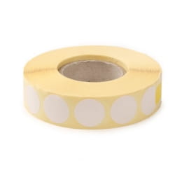 Białe samoprzylepne zaklejki do tarcz. Średnica 20mm, nawinięte na rolkę w ilości 2000 szt.
