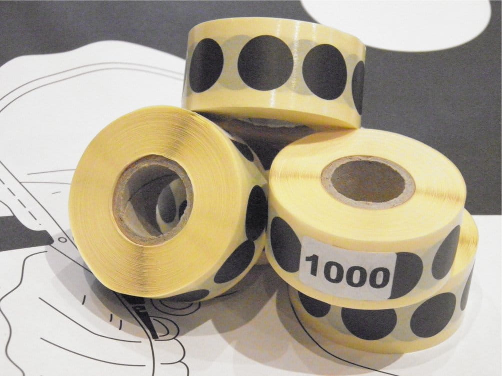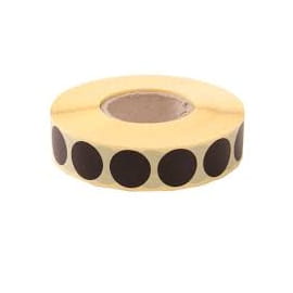 Czarne samoprzylepne zaklejki do tarcz. Średnica 25mm, nawinięte na rolkę w ilości 1000 szt.
